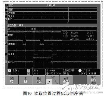 图10中SAMPLE有效时间为427ns;SAMPLE无效时间至读取角度/速度延时为750ns;RDVEL管脚选择读取角度/速度的延时为90ns;CS_RD有效时间为480ns,基本反映出从CS_RD下降沿至读取角度/速度的延时时间,CS_RD无效至下一次读取时间为200ns。