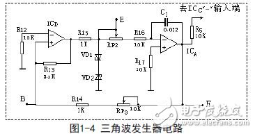 如图1-3所示,三角波发生器电路由ICD和ICA两个运算放大器组成。