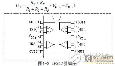 电路由给定电压、三角波发生器、电压比较器、功率输出器等四部分组成。结构框图如图1-1所示,其中给定电压部分使用一个运放,三角波发生器使用两个运放,电压比较器使用一个运放。LF347集成电路结构如图1-2所示。