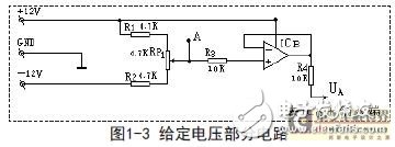 如图1-2所示,给定电压部分电路由R1、R P 1、R 2、I C B组成,调R P 1,可调A点电位(+4V~-4V),经R3接ICB同相输入端,它的反相输入端直接与输出端相连,是电压跟随器(电压放大倍数约等于1),这个电压送入电压比较器ICC的同相输入端: