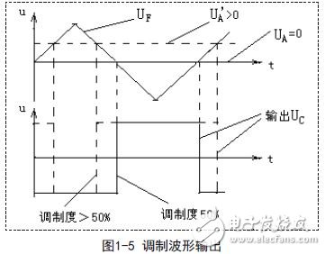 由此可见,当UA=0时,三角波UF在正半周时,输出-10V;三角波UF在负半周时,输出+10V,调制度为50%.UA越大,输出为+10V的时间越长,调制度上升;UA越小,输出为+10V的时间越短,调制度下降。因此调节给定电压UA的大小,就是调节输出正脉冲宽度(调制度),就可以调节输出电压平均值的大小。如图1-4所示。