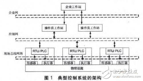 控制系统通常由一系列网络设备构成,包括:传感器、执行器、过程控制单元和通信设备。控制系统通常采用分层结构,典型的控制系统网络结构如图1所示,第一层为安装有传感器和执行器等现场设备的物理设施,现场设备通过现场总线网络与可编程逻辑控制器(PLC)或远程终端设备(RTU)连接,PLC或RTU设备负责实现局域控制功能。第二层为控制网络,主要负责过程控制器和操作员站之间的实时数据传输。操作员站用于区域监控和设置物理设施的设定值。第三层为企业网,企业工作站负责生产控制,过程优化和过程日志记录。