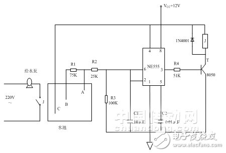 (1) 555定时器组成的水位自动控制器。图2可以看出,电路设计过于简单化,没有考虑异常情况的排除方法。例如:探头发生故障,则此系统无法检测,导致水位控制器操作异常;没有设计报警电路,无法方便地读取水位实际数值。