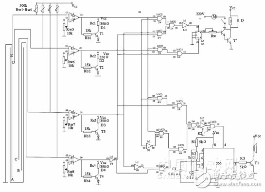 控制系统主要分为模拟检测和逻辑判断两大块。如图4所示,模拟检测实际上测量的是B、C、D、E四个探头相对于A点(即地)电位的高低,在水塔中清水里的四个探头B、C、D、E各点和探头A点之间实际上相当于一个可变电阻。当电阻值发生变化时,各点的电位值不同,通过逻辑判断,就得到不同的输出,即操作控制不同的动作。