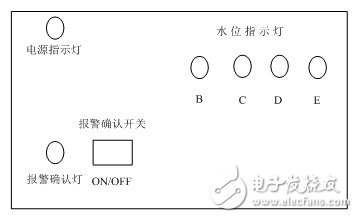 图6为水塔水位控制器的外观正视图,由电源指示灯、报警确认灯、水位指示灯以及报警确认开关组成。接通电源时,电源指示灯亮,当水塔中水深处于不同位置时,水位指示灯B、C、D、E情况不同。
