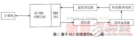 信号处理、温度调节等功能。在,温一个温度控制系统一般具有温度信号采集、PLC的温度控制系统中度信号的采集可以使用常用的温度传感器(热电偶、热电阻)。由温度传感器检测来的信号不是标准的电压(电流)信号,不能直接送给A/D转换模块。因此温度传感器采集到的温度信号要经过变送器的处理后才能被A/D转换器识别并转换为相应的数字信号。根据所使用的温度传感器选用对应的温度变送器。S7-200系列PLC常用的模拟量输入输出混合模块为EM235,EM235为4路模拟量输入,1路模拟量输出。PLC对温度信号进行处理后,通过模拟量模块输出电流信号,电流信号可以通过调压器来控制电源的开度(即一周期内的导通比率),从而控制电源的输出功率。加热器根据电源输出功率调节加热强度,从而达到温度调节的效果。其系统如图2所示。