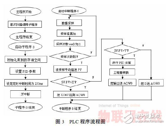 由于电加热炉具有较大的延时性,所以采输出值,0.0~1.012 Kc数正数双字,实数I 回路增益,正、负常数16 Ts I 采样时间,单位为s,正20 Ti I 积分时间常数,单位为min,24 Td I 微分时间常数,单位为min,正数式控制。大致采用三段控制: 第一段,开始阶段置电源为满开度,以最大的功率输出克服热惯性; 第二段,等到温度达到一定值转为PID控制; 第三段,接近设定点时置电源开度为0,提供一个保温阶段,以适应温度的滞后温升。程序流程图如图3 所示,图中X,Y根据实际设定。