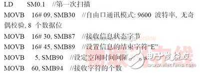 PLC 的CPU 处于STOP 模式时,自由口通讯被禁止,只有当CPU 处于RUN 模式时,才可使用自由口通讯。SMB30(这里选择端口0)是自由口模式控制字节,用来设定校验方式、通讯协议、波特率等通讯参数。发送指令XMT 启动自由端口模式下数据缓冲区中的数据发送,它可以方便地发送1~255 个字符,如果有中断程序连接到发送结束事件上,在发送完成后,端口0 会产生中断事件9,也可以监视发送完成状态位SM45 的变化。接收指令RCV 可以初始化接收信息服务,通过指定的通讯端口接收信息并存储在数据缓冲区内。在接收完最后一个字符时,端口0 产生中断事件23. PLC 初始化程序如下: