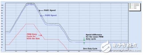 值得注意的是,在PWM引脚的低占空比状态下,所有风扇的表现并不一致。某些风扇在PWM引脚占空比接近0%时会停止旋转,而有些风扇此时仍继续转动。这两种情况下,占空比与RPM关系可能是非线性关系,也可能是并未指定。同样,两台相同风扇在相同占空比情况下转速可能不同。在利用占空比与RPM信息时,应当使用线性区中明确限定风扇行为的两个数据点。从图4可以看出,PWM占空比为0情况下转速并非0.图4另外说明,对于给定的PWM占空比,相同风扇具有不同转速。