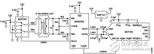 ADA2200同步解调器可在信号解调至与LVDT核心位移成比例的低频输出电压之前对LVDT次级信号进行滤波,从而提取位置信息。ADA2200驱动AD7192 24位Σ-Δ型ADC,后者对输出进行数字化和滤波处理。ADA2200产生同步LVDT激励信号,而ADG794开关将CMOS电平激励信号转换为精密3.3 V方波信号,驱动LVDT初级绕组。