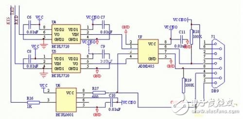 SPC3芯片通过请求发送信号(RTS),发送数据信号(TXD),接收数据信号(RXD),通过高速光耦HCPL7720和总线收发器ADM1485相连,构成串行总线接口。如图2所示,尽管SPC3已经集成了物理层的数据传输功能,但它不具备RS-485的驱动接口,因此添置了RS-485的驱动电路。目前能满足12M波特率的驱动器芯片为数不多,有SN65ALS176,SN75ALS176,ADM1485等,本系统中选用的是ADM1485.另外为了避免总线上的信号对电路的影响,在SPC3与RS-485总线驱动电路之间采用光电隔离。TXD、RXD信号的隔离器件选用Hewlett Packar公司的12M高速光耦HCPL7720,RTS的信号隔离器件选用HCPL0601.