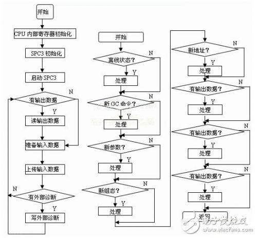 对SPC3的软件操作主要包括两个部分:SPC3的初始化和SPC3的中断处理。主程序和中断程序流程图分别如图3和图4所示。