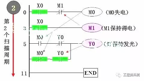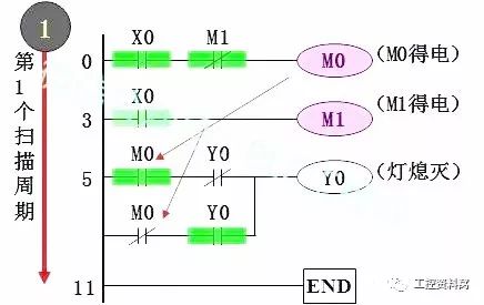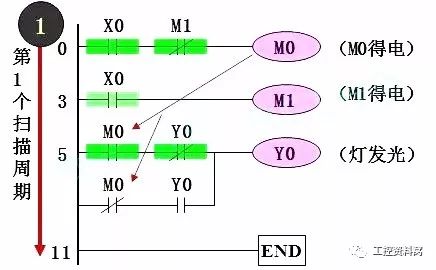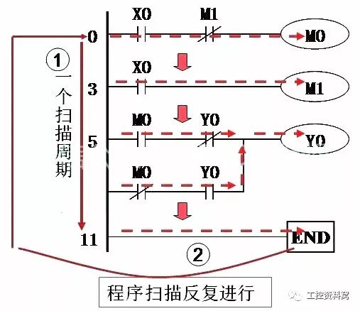 循环扫描:也就是从程序的首端到底端、从左端到右端,逐行扫描,不断地重复!