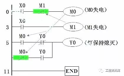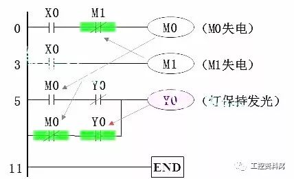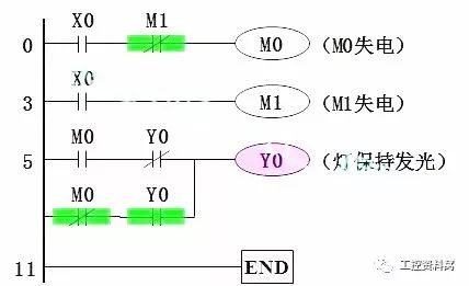 二分频电路的实现方式很多,为了更好的体现本期的主题(PLC的工作方式),将采用基本逻辑指令来编写,详细见下图;其中:按钮——X0,灯——Y0。