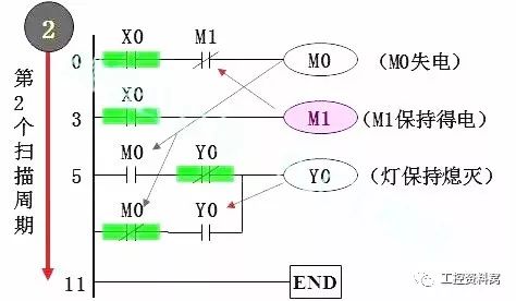 图3、按钮按到底,(还未松开),PLC开始第二个扫描周期(假设是第二个,扫描周期很快的)