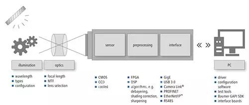 仔细思考,事实上这两个概念传递了非常重要的信息,机器视觉归根结底是一种应用主导型技术,即是由市场和应用需求来驱动的,机器视觉本身需要一个复杂的硬件和软件系统进行支撑,这其中就包括了客户的具体应用要求、软件、工业电脑、工业相机、镜头和光源等。请参考图一Baumer公司的示意图。