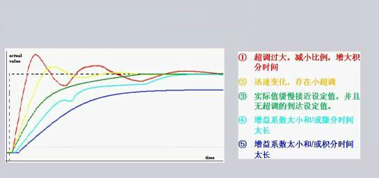 一般使用PID的自整定即可完成调节,面板上反馈出PID趋势图,当然也可以使用手动调节PID的功能。PID调节是没有所谓的经验值可以参考的,以下几种都存在一定的瑕疵。
