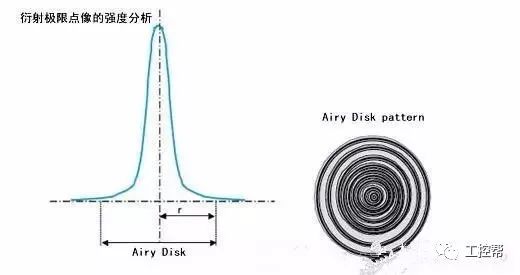 Airy Disk是指通过没有失真的镜头在将光集中一点时,实际上形成的是一个同心圆。这个同心圆就叫做Airy Disk。Airy Disk的半径r可以通过以下的计算公式计算出来。这个值称为解析度。r= 0.61λ/NA Airy Disk的半径随波长改变而改变,波长越长,光越难集中于一点。 例:NA0.07的镜头 波長550nm r=0.61*0.55/0.07=4.8μ