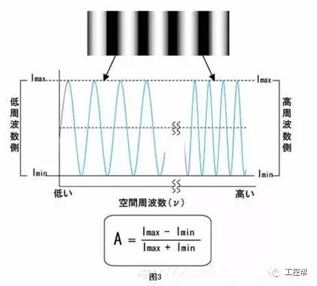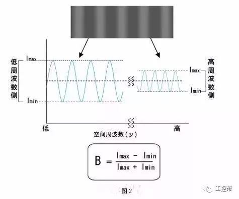 图1所示,黑白矩阵波,黑白的对比度为100%.这个对象被镜头摄影后,成像的对比度的变化被定量化。基本上,不管什么镜头,都会出现对比度降低的情况。最终对比度降低至0%。,不能进行颜色的区别。