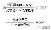 景深 = 2 x Permissible COC x 实效F / 光学倍率2 = 允许误差值 / (NA x 光学倍率)