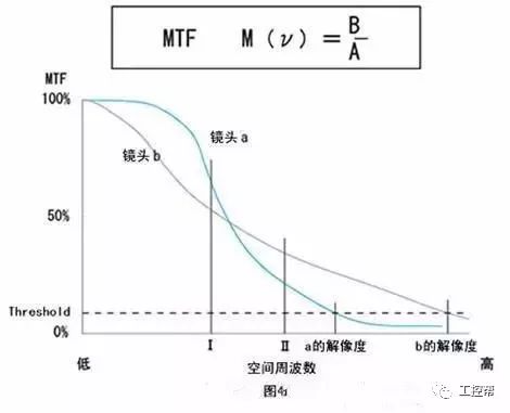 解析度与MTF的关系:解析度是指2点之间怎样被分离认识的间隔。一般从解析度的值可以判断出镜头的好坏,但是实际是MTF与解析度有很大的关系。图4显示了两个不同镜头的MTF曲线。镜头a 解析度低但是具有高对比度。镜头b对比度低但是解析度高。