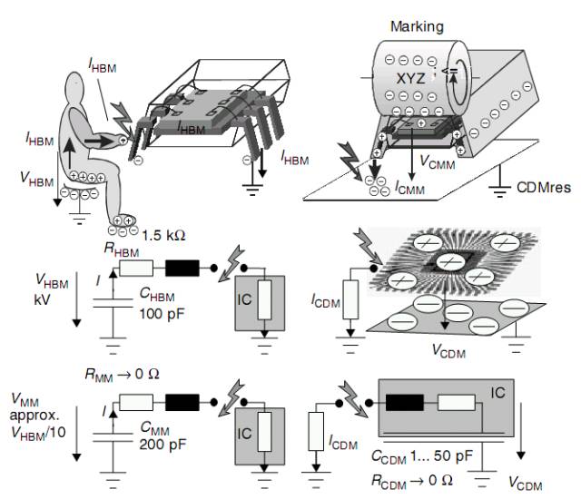 1、人体放电模式(HBM):当然就是人体摩擦产生了电荷突然碰到芯片释放的电荷导致芯片烧毁击穿,秋天和别人触碰经常触电就是这个原因。业界对HBM的ESD标准也有迹可循(MIL-STD-883C method 3015.7,等效人体电容为100pF,等效人体电阻为1.5Kohm),或者国际电子工业标准(EIA/JESD22-A114-A)也有规定,看你要follow哪一份了。如果是MIL-STD-883C method 3015.7,它规定小于<2kV的则为Class-1,在2kV~4kV的为class-2,4kV~16kV的为class-3。