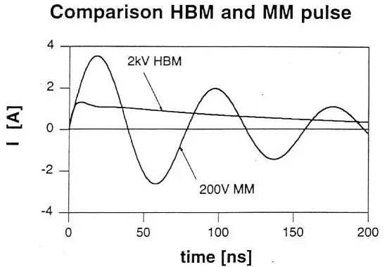 2、机器放电模式(MM):当然就是机器(如robot)移动产生的静电触碰芯片时由pin脚释放,次标准为EIAJ-IC-121 method 20(或者标准EIA/JESD22-A115-A),等效机器电阻为0 (因为金属),电容依旧为100pF。由于机器是金属且电阻为0,所以放电时间很短,几乎是ms或者us之间。但是更重要的问题是,由于等效电阻为0,所以电流很大,所以即使是200V的MM放电也比2kV的HBM放电的危害大。而且机器本身由于有很多导线互相会产生耦合作用,所以电流会随时间变化而干扰变化。