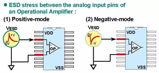 4、Analog-pin放电测试:因为模拟电路很多差分比对(Differential Pair)或者运算放大器(OP AMP)都是有两个输入端的,防止一个损坏导致差分比对或运算失效,所以需要单独做ESD测试,当然就是只针对这两个pin,其他pin全部浮接(floating)。