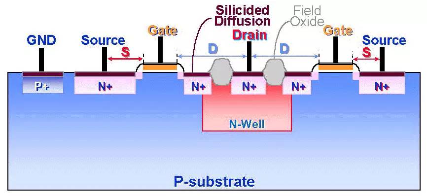 静电放电保护可以从FAB端的Process解决,也可以从IC设计端的Layout来设计,所以你会看到Prcess有一个ESD的option layer,或者Design rule里面有ESD的设计规则可供客户选择等等。当然有些客户也会自己根据SPICE model的电性通过layout来设计ESD。