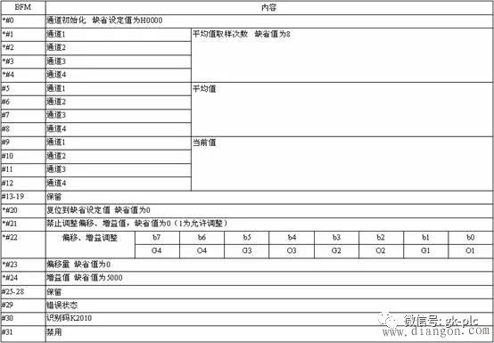 FX系列可编程控制器基本单元与FX—4AD、FX—2DA等模拟量模块之间的数据通信是由FROM指令和TO指令来执行的,FROM是基本单元从FX—4AD、FX—2DA读数据的指令,TO是从基本单元将数据写到FX—4AD、FX—2DA的指令。实际上读、写操作都是对FX—4AD、FX—2DA的缓冲寄存器BFM进行的。这一缓冲寄存器区由32个16位的寄存器组成,编号为BFM#0一#31。
