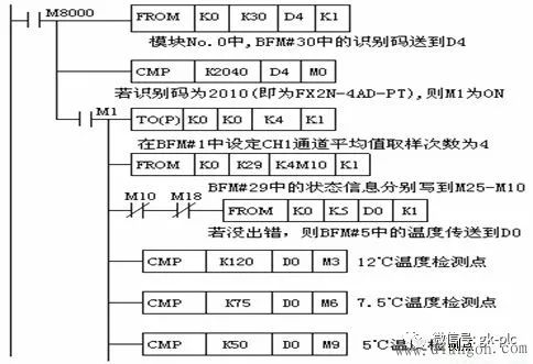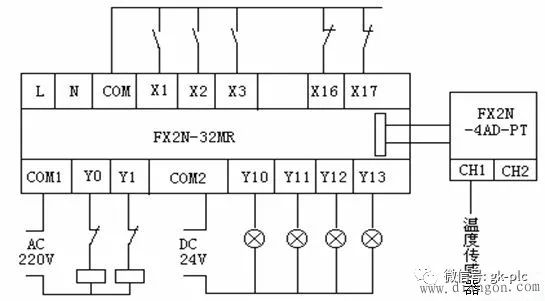 在这个控制系统中,温度点的检测可以使用带开关量输出的温度传感器来完成,但是有的系统的温度检测点很多,或根据环境温度变化要经常调整温度点,要用很多开关量温度传感器,占用较多的输入点,安装布线不方便,把温度信号用温度传感器转换成连续变化的模拟量,那么这个制冷机组的控制系统就是一个模拟量控制系统。对于一个模拟量控制系统,采用可编程控制器控制,控制性能可以得到极大的改善。在这里可以选用FX2N-32MR基本单元与FX2N-4AD-PT模拟量输入单元,就能方便的实现控制要求。