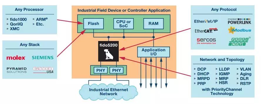 图1. 作为fido5000变体的fido5200 REM交换芯片,其支持包括EtherCAT在内的各种主要工业以太网协议。