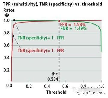 图6:对应于阈值的垂直线切割两条曲线的点,产生假阳性率和假阴性率。阈值的常见选择是产生近似相等的假阳性和假阴性率。对于CNN-Surfin',假阳性率为1.58%,假阴性率为1.49%。