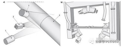 图2:a):为了使系统能够精确地捕获钢管表面(3)的360°图像,系统使用三组激光器(1)和14000 lines/s线扫描相机(2)。B):激光器和相机组以120°角度间隔安装在垂直于滚动轴平面的同一平面内,相机位于推进台输出端周围的保护罩壳中。