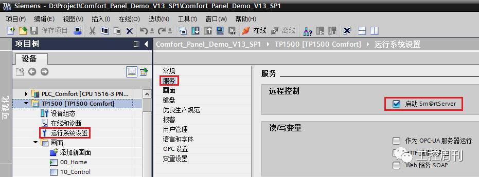 当程序下载完成后,在触摸屏的控制面板中可以找到Sm@rtServer服务的选项。通过“Settings->WinCC Internet Settings”打开设置界面。