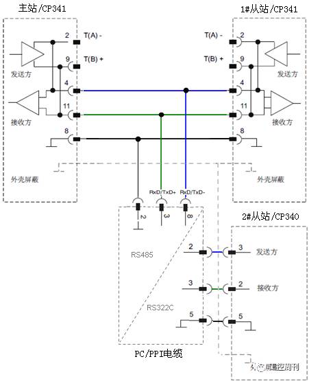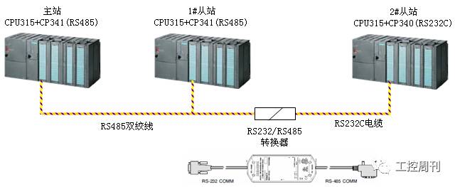 如下图所示,系统包括3个SIMATIC S7-300站,其中一个作为串行通信的主站,通过ASCII驱动协议轮询采集另外两个从站的数据。系统主站和1#从站各配置了一个串行通信模块CP341(6ES7341-1CH01-0AE0)(RS422/485接口),2#从站配置了一个串行通信模块CP340(6ES7340-1AH02-0AE0)(RS232C接口),为了将它们连接到一个网络中,在本例中选择了西门子的PC/PPI电缆(6ES7901-3CB30-0XA0)将2#从站的RS232C接口转换为RS485接口连接到网络中。