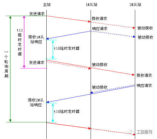 ☞发送完成:启动接收作业,准备接收从站返回数据。同时启动一个超时定时器T11,如果超时定时时间到,还没有接收到数据,则放弃等待,开始轮询下一个站。