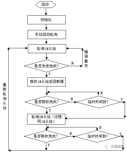 如下图所示,在系统初始化完成后,手动启动第一次轮询作业,本实例先轮询1#从站。给1#从站发送查询请求后,等待1#从站的响应,如果在指定的延时时间内接收到1#从站返回的数据,则给2#从站发送查询请求,并等待2#从站的响应,同样如果在指定的延时时间内接收到2#从站返回的数据,则一次完整的轮询结束,自动启动新一轮的轮询。