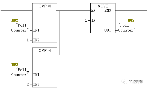 这里定义MW2作为轮询计数器,程序开始,先对轮询计数器进行操作,默认先轮询1#从站,将值1赋值给MW2。