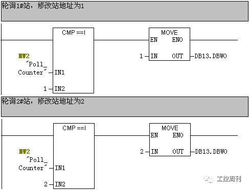 在程序执行过程中,会修改轮询计数器的值,通过判断轮询计数器的值对发送数据块的地址标识符字作相应的修改,以完成对响应从站的轮询。这里具体的实现如下图,其中DB13作为发送数据块,DB13.DBW0为地址标识符字。