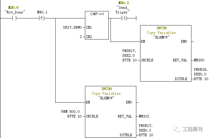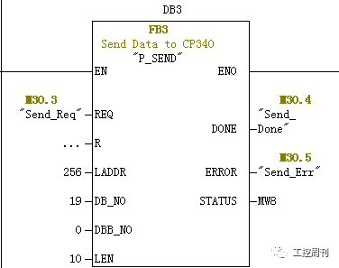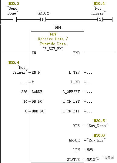 初始化完成后,可以启动发送功能。这里第一次发送采用手动方式,通过触发手动启动标志位M30.1,并调用FB8 P_SND_RK发送数据到从站。完成第一次发送后,可以通过程序自动修改自动轮询标志位M30.0来实现自动发送数据到从站的功能。