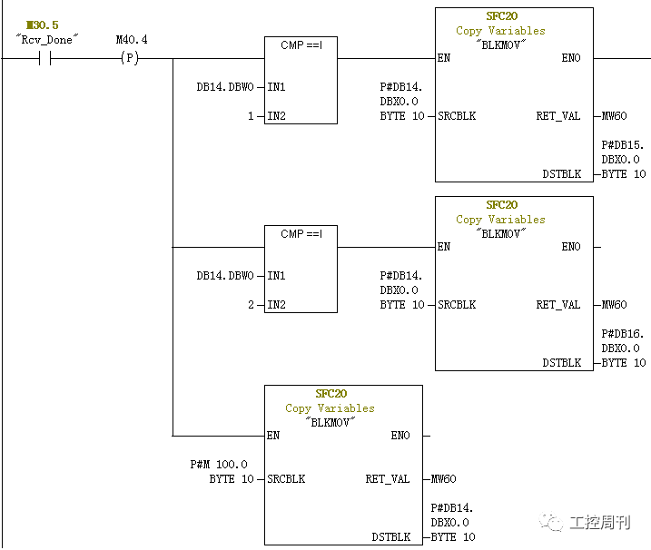 发送完成后,启动接收作业,准备接收从站返回数据,并将接收到的数据先放到接收缓冲区中,这里DB14数据块为接收缓冲区。