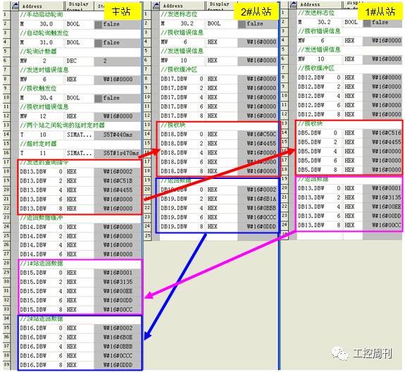 搭建好网络,并将程序分别下载到各自的CPU中,启动CPU的运行。通过置位手动启动轮询标志位M30.0即可启动轮询程序的运行。通过变量表可以监视到系统的运行情况,可以看到,主站会循环地将数据发送到两个从站,同时也循环地接收来自从站的返回数据,如下图所示。