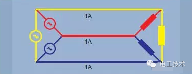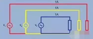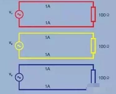 使用三相系统的原因有两个: 1.可以使用三个矢量间隔的电压,在马达中产生旋转磁场。从而可以在不需要额外绕组的情况下启动马达。 2.三相系统可以连接到负载上,要求的铜缆连接数量(传输损耗)是其它方式的一半。 我们看看三个单相系统,每个系统为一个负载提供100W的功率(图3)。总负载是3x100W=300W.为提供电力,1安培电流流经6根线,因此有6个单位的损耗。也可以把三个电源连接到一个公共回程上,如图4所示。当每个相位中的负载电流相同时,负载被认为是均衡的。在负载均衡、且三个电流相位彼此位移120°的情况下,任何时点上的电流之和都为零,回程线路中没有电流。