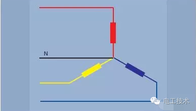 在三相120°系统中,要求3根线传送功率,而在其它方式下则要求6根线。要求的铜缆数量减少了一半,导线传输损耗也将减半。 Y形接法或星形接法 拥有公共连接的三相系统通常如图5的示意图所示,称为“Y形或星形”接法。 公共点称为中性点。为安全起见,这个点通常在电源上接地。在实践中,负载并不是完美均衡的,要使用第四条“中性”线传送得到的电流。如果本地法规和标准允许,中性导体可能会比三条主导体小得多。