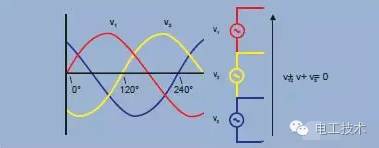 三角形接法 上面讨论的三个单相电源也可以串联起来。在任何时点上,三个120°相移电压之和都是零。如果和为零,那么两个端点都处在相同的电位,可以联接在一起。这种接法如图7中的示意图所示,使用希腊字母Δ表示,称为三角形接法。