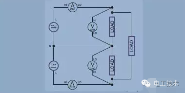 单相三相连接 在这个系统中,如图11所示,从一个中心分接的变压器线圈中产生电压,所有电压都同相。这在北美住宅应用中十分常见,其中提供了一个240V电源和两个120V电源,在每条腿线上可能有不同的负载。为测量总功率和其它数量,应如图11所示连接两个功率表。