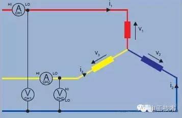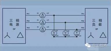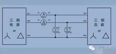 三相三线接法-两个功率表方法 在有三根线时,要求两个功率表测量总功率。根据图所示方法连接两相到功率表的电压端子。