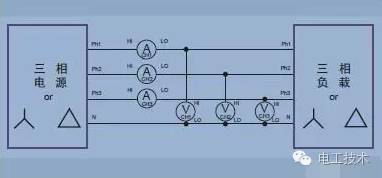 三相四线接法 测量四线系统中的总功率要求三个功率表。测得的电压是真实的相电压。通过使用矢量数学运算,可以从相电压的幅度和相位中准确地计算出相间电压。现代电源分析仪也使用基尔霍尔定律,计算流过中线的电流。