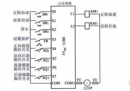 PLC的输入信号:正转启动按钮SB1,反转启动按钮SB2,停止按钮SB3,热继电器常开触点FR、正向前进限位开关SQ1、反向后退限位开关SQ2、前进极限限位开关SQ3、后退极限限位开关SQ4。